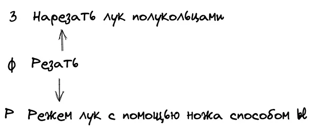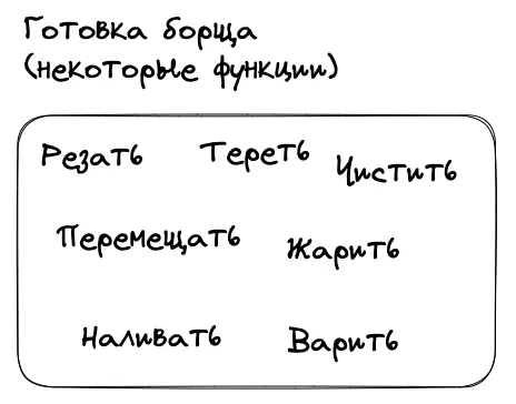 Так, например в процессе приготовления борща будут такие типовые операции как: чиста овощей, нарезка овощей, нарезка мяса. Которые в свою очередь можно сгруппировать в этапы: подготовка овощей, варка бульона, делание зажарки, соединение всех ингредиентов в кастрюле.