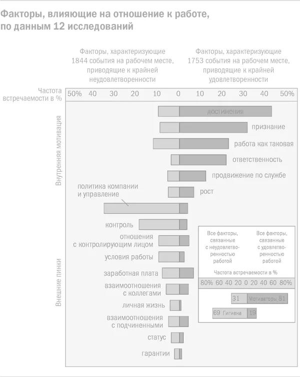 Совокупность факторов, связанных с удовлетворенностью и неудовлетворенностью работой, выявленная по итогам опроса 1685 работников, показана на диаграмме «Факторы, влияющие на отношение к работе, по данным 12 исследований». Результаты демонстрируют: мотиваторы служат главным источником удовлетворения, а пинки – главным источником неудовольствия от работы. Эти 12 исследований были проведены среди следующих групп работников: руководители низшего звена; женщины-специалисты; управляющие сельскохозяйственных предприятий; мужчины-менеджеры, собирающиеся выходить на пенсию; технический персонал больниц; контролеры промышленных предприятий; медсестры; работники общепита; военные офицеры; инженеры; ученые; домработницы; учителя; технические специалисты; женщины-сборщицы на конвейере; бухгалтеры; финские прорабы; венгерские инженеры. Респондентов спрашивали, какие события в их трудовой жизни рождали в них удовлетворенность или неудовлетворенность. Ответы были зафиксированы в долях процентов от всех «позитивных» и «негативных» событий. (Общая сумма процентов как в «пинках», так и в «мотиваторах» может составлять более 100 %, так как часто одно событие отнесено к двум или более факторам; к примеру, продвижение по службе часто предполагает и повышение ответственности.)