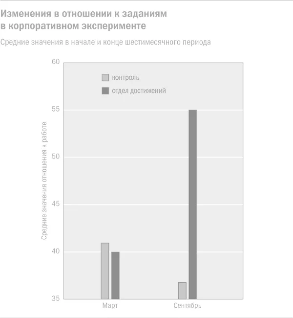 Диаграмма «Изменения в отношении к заданиям в корпоративном эксперименте» пока- зывает отношение к работе в двух группах, измеренное в конце марта, прямо перед введением первого мотиватора, и в конце сентября. Сотрудникам задали 16 вопросов, связанных с мотивацией. Один из них, например, звучал так: «Сколько, по вашему мнению, у вас существует возможностей сделать значимый вклад в общее дело на своей работе?» Ответы оценивались по шкале от 1 до 5, так что максимально возможная сумма баллов составляла 80. Сотрудники отдела достижений стали гораздо более позитивно воспринимать свою работу, в то время как в контрольной группе настроение осталось на том же уровне (видимое на диаграмме снижение не является статистически значимым). […]