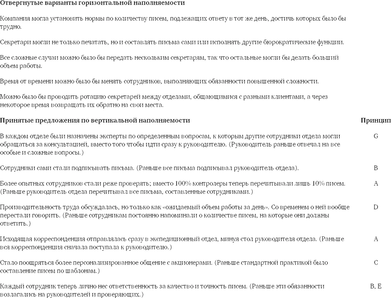Разницу между горизонтальной и вертикальной наполняемостью работы можно проиллюстрировать на примере из очень успешного эксперимента по обогащению труда. Он проводился в одной крупной корпорации и касался сотрудников, в чьи обязанности входила переписка с акционерами. Очевидно, что перед этими тщательно отобранными и хорошо обученными профессионалами стояла непростая задача. Почти все показатели эффективности и отношения к работе были низкими, и в ходе опроса подтвердилось, что понимание ответ- ственности возложенной задачи существовало преимущественно на словах, а не на деле.