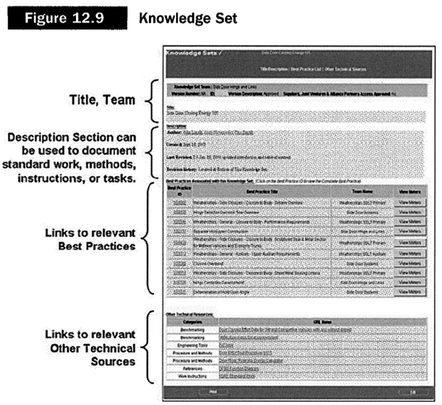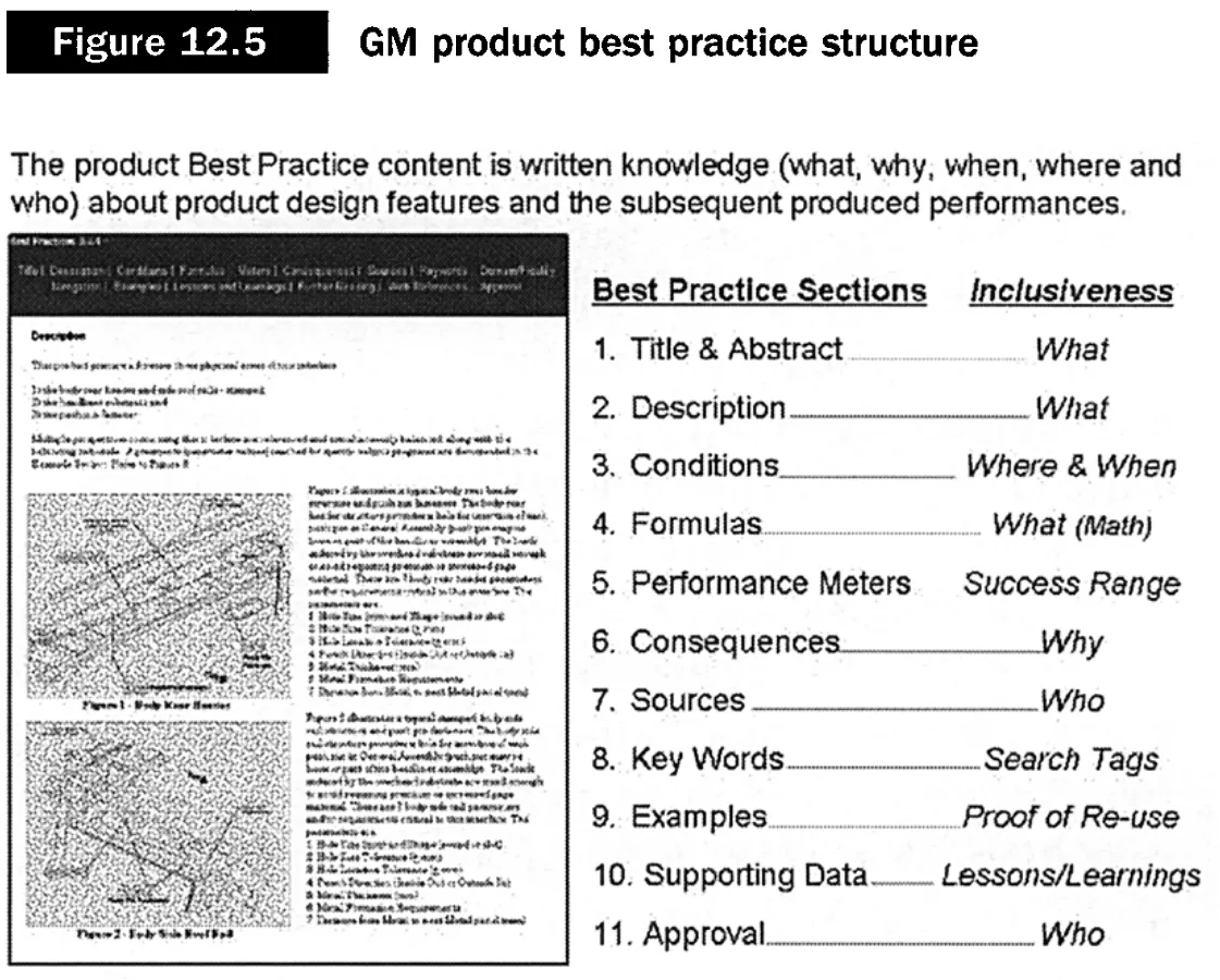 Успех и выводы, полученные в ходе этого пилотного проекта, были использованы при разработке и внедрении текущей базы знаний «Техническая память — передовой опыт». Структурированное содержание нашего текущего передового опыта детализировано как часть шестой из восьми дисциплин предлагаемой модели области управления знаниями. (Винеке и Флипо, Область управления знаниями, General Motors Corporation, октябрь 2003 г., стр. 13–15.) На рис. 12.5 показана структура «что-почему-когда-где-кто» передового опыта производства продукции GM.