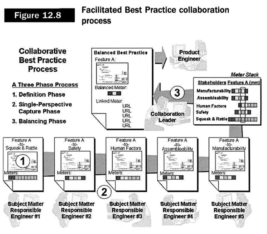 Эта первая проблема была решена путем разработки формального процесса сотрудничества, который позволяет каждой кросс-функциональной области писать о взаимно согласованном инженерном решении (включая номенклатуру, иллюстрации и исходные данные) с точки зрения их функциональной области. Используя метод графического представления (см. рис. 12.7), кросс-функциональные точки зрения сбалансированы, а сбалансированное решение отражено в сбалансированном передовом опыте, который имеет приоритет над передовым опытом с одной перспективой.