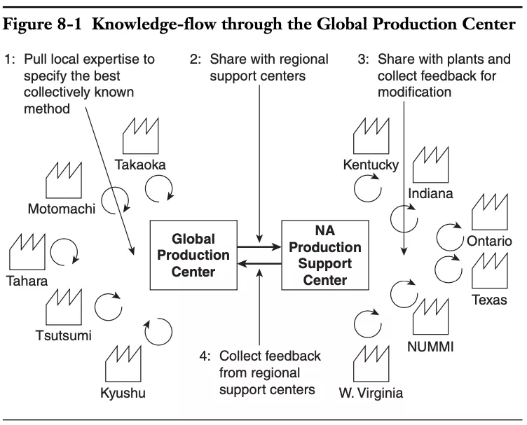 Экспорт знаний из GPC не ограничивался Японией. В конце концов, одной из главных бизнес-проблем GPC был рост бизнеса за морем, опережающий возможности Toyota по подготовке достаточного количества менеджеров в стиле Toyota. Отточив и проверив свои подходы на заводах Toyota в Японии, GPC пригласила представителей из Европы, Азии и Америки в Японию для изучения навыков, нацеленных на GPC, практики использования разработанных GPC методов обучения и оборудования (см. рис. 8-1), и предлагают свой собственный вклад. Здесь мы видим, что GPC участвует в классическом примере Способности 3. Она решила проблему и теперь делится своими новообретенными знаниями, причем делает это там, где эти знания были обнаружены, и делится как процессом обнаружения, так и решением.