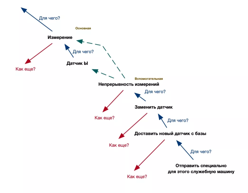 А вот доставка со склада нового датчика в случае его замены это уже конкретная реализация решения задачи (которое в свою очередь порождает новую задача его оптимально реализации). То есть здесь мы стараемся сформулировать функции так чтобы сама формулировка наталкивала нас иные варианты решения. Для этого мы можем на более высокий или более низкий системные уровни = к надфукции или подфункции, а так же группировать функции или дробить их для нахождения уровня постановки задачи.